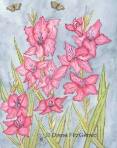 We know autumn is near when Mr. Clark has beautiful gladiolus at his farm stand at the Barrie Farmers’ Market. Pink gladioli are often associated with compassion and care. Butterflies, with freedom and a joyful soul. The spider and it’s tiny web, patience and dedication to success.