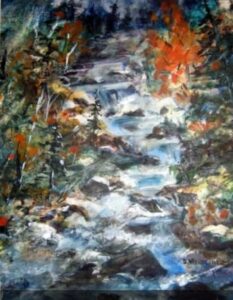 The inspiration for Cascading Falls was a beautiful waterfall close to the area where I grew up. This piece is painted on illustration board and captures the essence of a familiar fall scene in Northern Ontario.